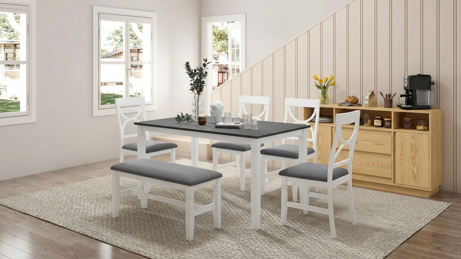 TOPMAX 6-Piece Wood Half Round Dining Table Set Kitchen Table Set with Long Bench and 4 Dining Chairs, Modern Style, Natural